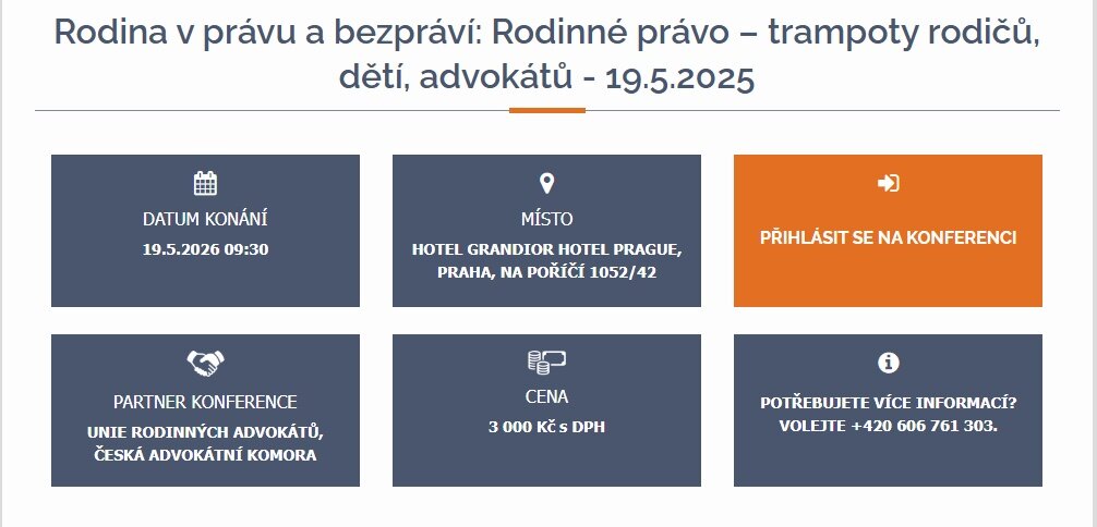 Zvýhodněnou cenu účastnického poplatku mají členové Unie rodinných advokátů a advokáti zapsaní v České advokátní komoře (pro slevový kód prosím kontaktujte vedení Unie).